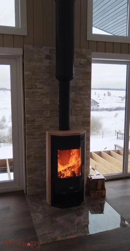 Облицовка из натурального камня. Режим медленного горения, вторичный дожиг, централизованная подача воздуха. Диапазон мощности: 2-6.5 кВт.